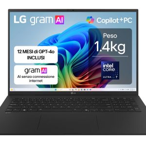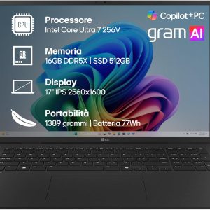 LG gram AI 17Z90TL Copilot+ PC, Notebook 17" 2.5K, Intel Core Ultra 7 (Series 2) 256V, 16GB RAM, 512GB SSD, AI PC, Ultralight only 1.4 kg, 77Wh Battery, Windows 11 Black Core PC Home 1, Windows 11 Ultra Core+1 (سری 2) 16 گیگابایت، 512 گیگابایت