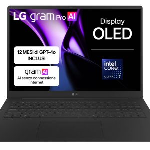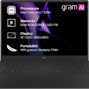 LG gram Pro 16Z90TP، نوت بوک 16 اینچی OLED 2880×1800، Intel Core Ultra 7 (سری 2) 255H، 16 گیگابایت رم، 1 ترابایت SSD، فقط 1.2 کیلوگرم، باتری 77 وات ساعت، Windows 11 Home، صفحه کلید ایتالیایی Ultra (Corpie) 255 ساعت 16 گیگابایت DDR4، 1 ترابایت SSD گرم پرو مشکی