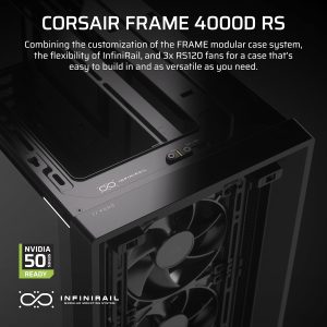 قاب ماژولار CORSAIR 4000D RS Frame High Air Mid-Tower PC – فن های 3X CORSAIR RS – سیستم نصب فن InfiniRail – متناسب با چند رادیاتور 360 میلی متری – سازگار با مادربرد با رابط معکوس – Black FRAME 4000D RS Black