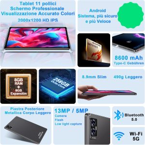 AOCWEI 2024 Android 13 Tablet 11 Inch 2K 16GB RAM+256GB ROM (TF 512GB) |5G+2.4G WiFi | بلوتوث 5.0 | هشت هسته ای | 2.0 گیگاهرتز | 8600 میلی آمپر ساعت | 2000 * 1200 پیکسل | 5+13 مگاپیکسل | تبلت با صفحه کلید و ماوس، قاب خاکستری 3