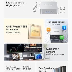 minisforum ai x1 mini pc ، amd ryzen پردازنده 7 255 8-core 16-thread تا 4.9 ghz ، amd radeon 780m ، barebone بدون ddr5 ram/pcie 4.0 ssd ، hdmi/dp/usb4 x 2/2.5 g rj45 ، usb 3.2 x 2 ، wifi 7 ، wifi 7 ، wifi 7.