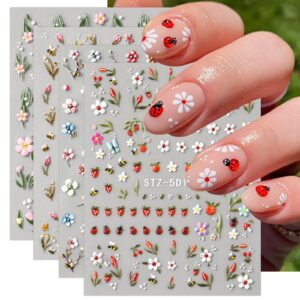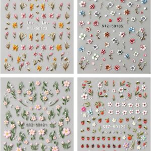 JMEOWIO 3D Flowers Fruit Nail Art Stickers, Nail stickers 5D Nail Art designs 4 sheets