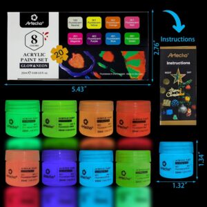 Artecho 8C Neon & Glow in the Dark – مجموعه رنگ اکریلیک 2 در 1، بطری روشن 20 میلی لیتری (8 x 20 میلی لیتر)