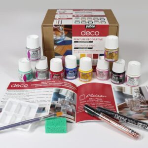 جعبه مجموعه Pebeo Deco – رنگ اکریلیک مبتنی بر آب، ایدهآل برای تزئین روی پایههای مختلف – 10 بطری مختلف 45 میلیلیتری – 2 نشانگر اکریلیک + لوازم جانبی + راهنمای خلاقانه