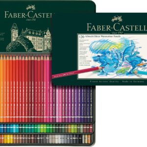 مداد آبرنگ Faber-Castell 117511 Albrecht Dürer، شیشه با 120 مداد، 3.8 میلی متر سرب، مجموعه مداد رنگی حرفه ای با رنگدانه های محلول در آب که تنها با چند ضربه قلم مو تبدیل می شوند، جعبه فلزی 1 واحد (بسته 120 عددی)