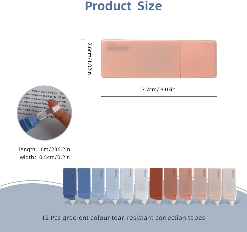 - 【Gradient Color】You will receive 12 different colors of adhesive tape. Putting them together, you will find that they feature gradient colors of blue and red. This color is aesthetically pleasing and works well in decorations. 12 correction tapes can satisfy your needs for a long time. The correction tape has a smooth surface and is very compact, so it can be easily placed in your pocket or pencil case; With a protective cover to avoid damaging and staining the tape, easy to use and carry.