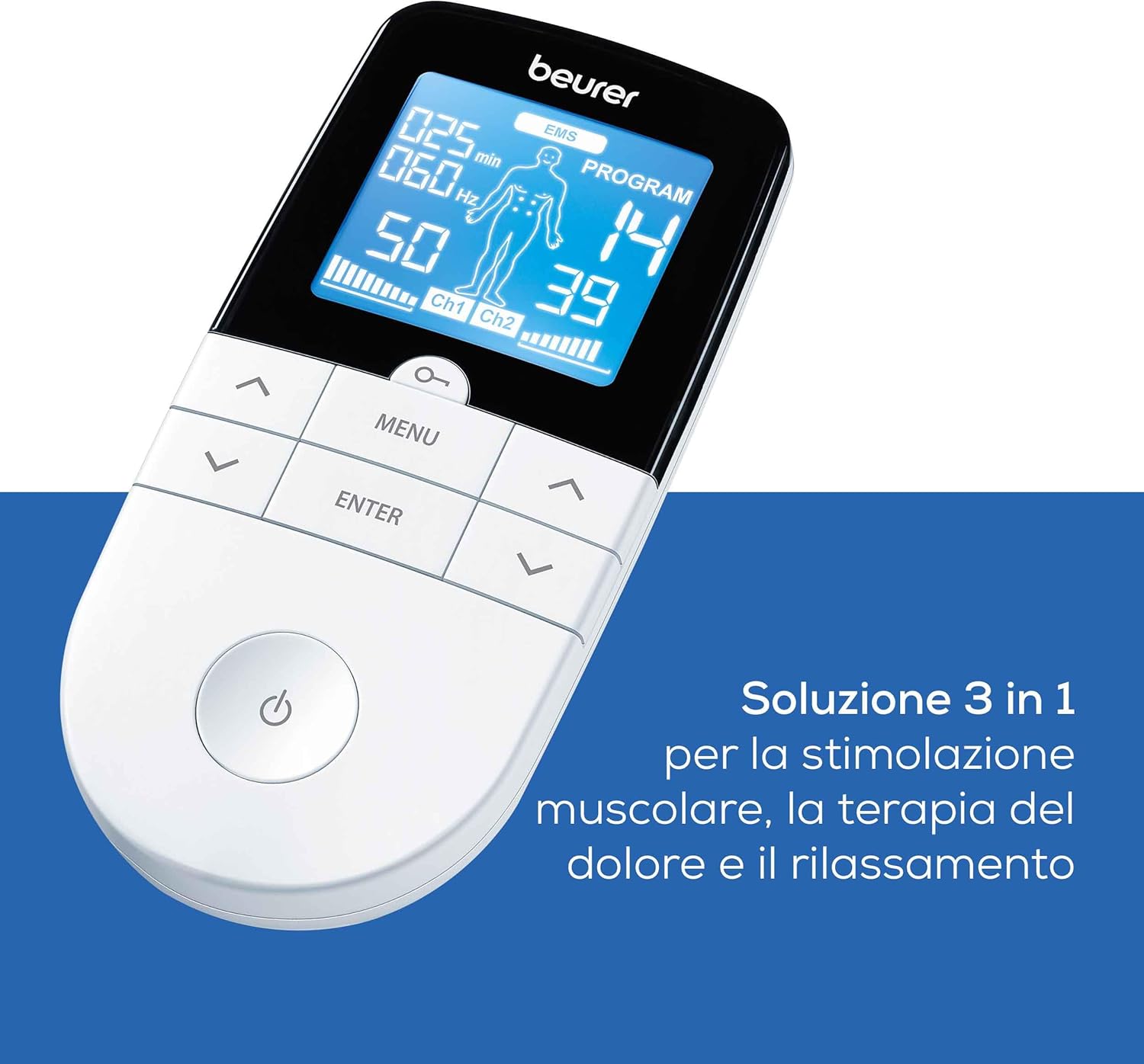 Beurer EM 49 TENS DIGITAL TENS/EMS ، Electrostimulator 3 in 1 برای تسکین درد از طریق الکترواستیمولاسیون عصبی ، آموزش EMS ، عملکرد ماساژ ، 2 کانال ، 6 برنامه ، 4 تن/الکترود EMS با 4 الکترود