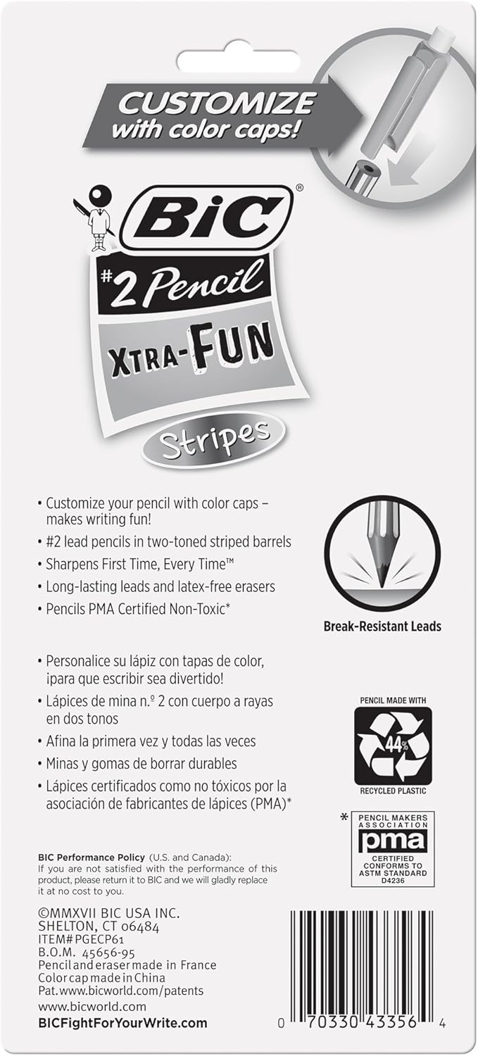 با مدادهای گرافیت شخصی BIC Xtra-Fun به نوشتن خود سرگرمی اضافه کنید! این مدادها دارای بشکه های راه راه دو رنگ و کلاهک های قابل تعویض در رنگ های روشن هستند که به شما امکان می دهد ترکیب رنگ های دلخواه خود را ایجاد کنید. سرنخهای #2 مقاوم در برابر شکستگی، نرم مینویسند و تیز کردن مداوم را کاهش میدهند، در حالی که پاککنهای بدون لاتکس قدرت پاککنندگی بیشتری را ارائه میکنند. بند نیز تمیز پاک می شود و به مرتب کردن کار شما کمک می کند. مدادهای گرافیتی سفارشی BIC Xtra-Fun دارای گواهینامه PMA غیر سمی هستند و برای استفاده در خانه یا کلاس ایده آل هستند.