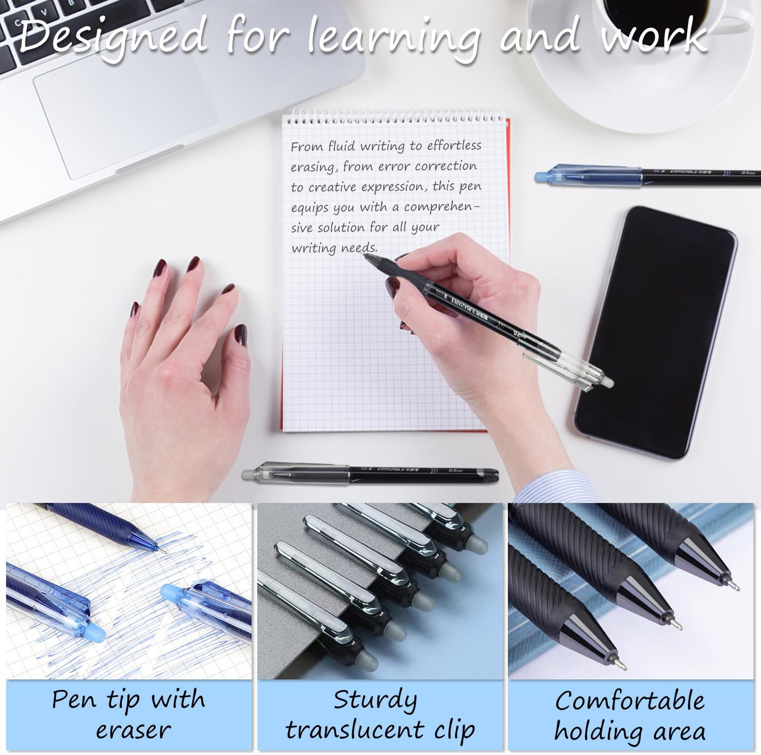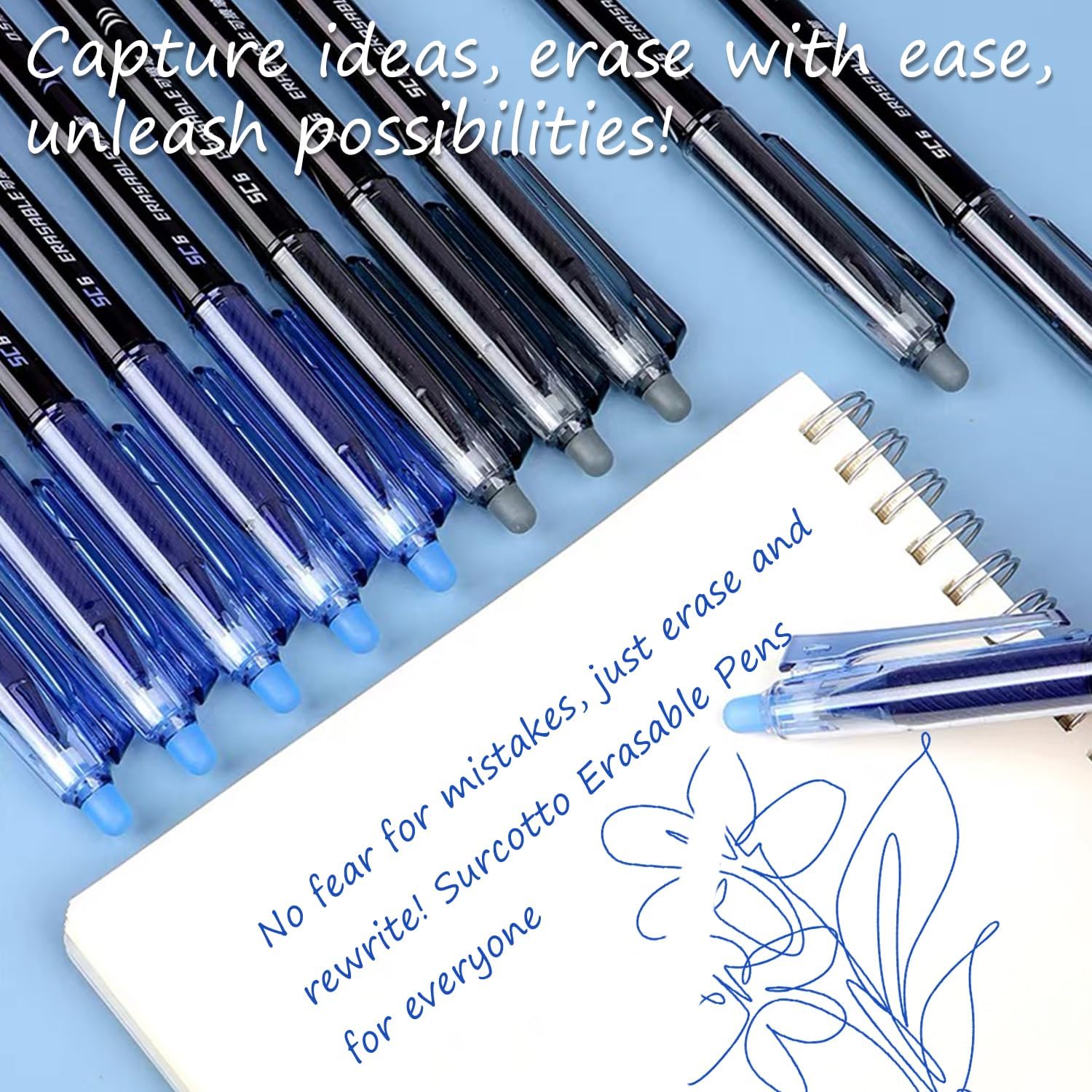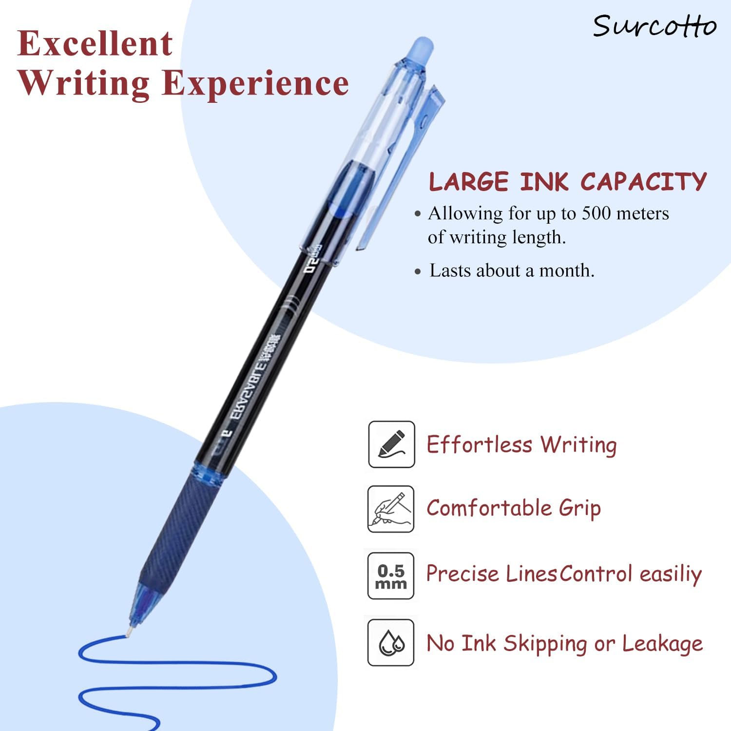 - Surcotto Erasable Pens: With a 0.5mm fine tip, smooth ink flow and the ability to easily erase mistakes without damaging the paper, these gel pens give you the freedom to explore your thoughts, allowing you to express your ideas smoothly. Redefine writing excellence with it!