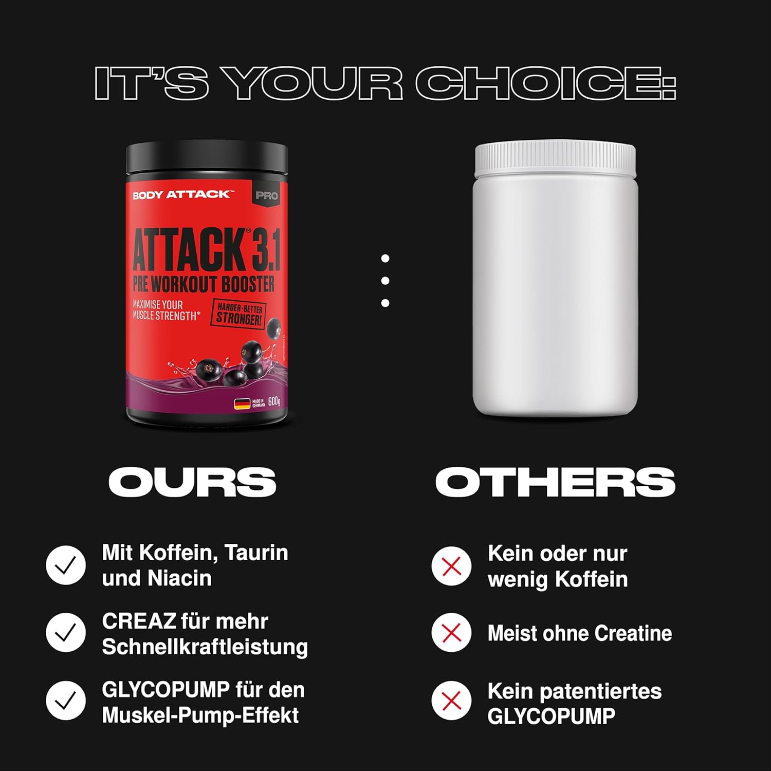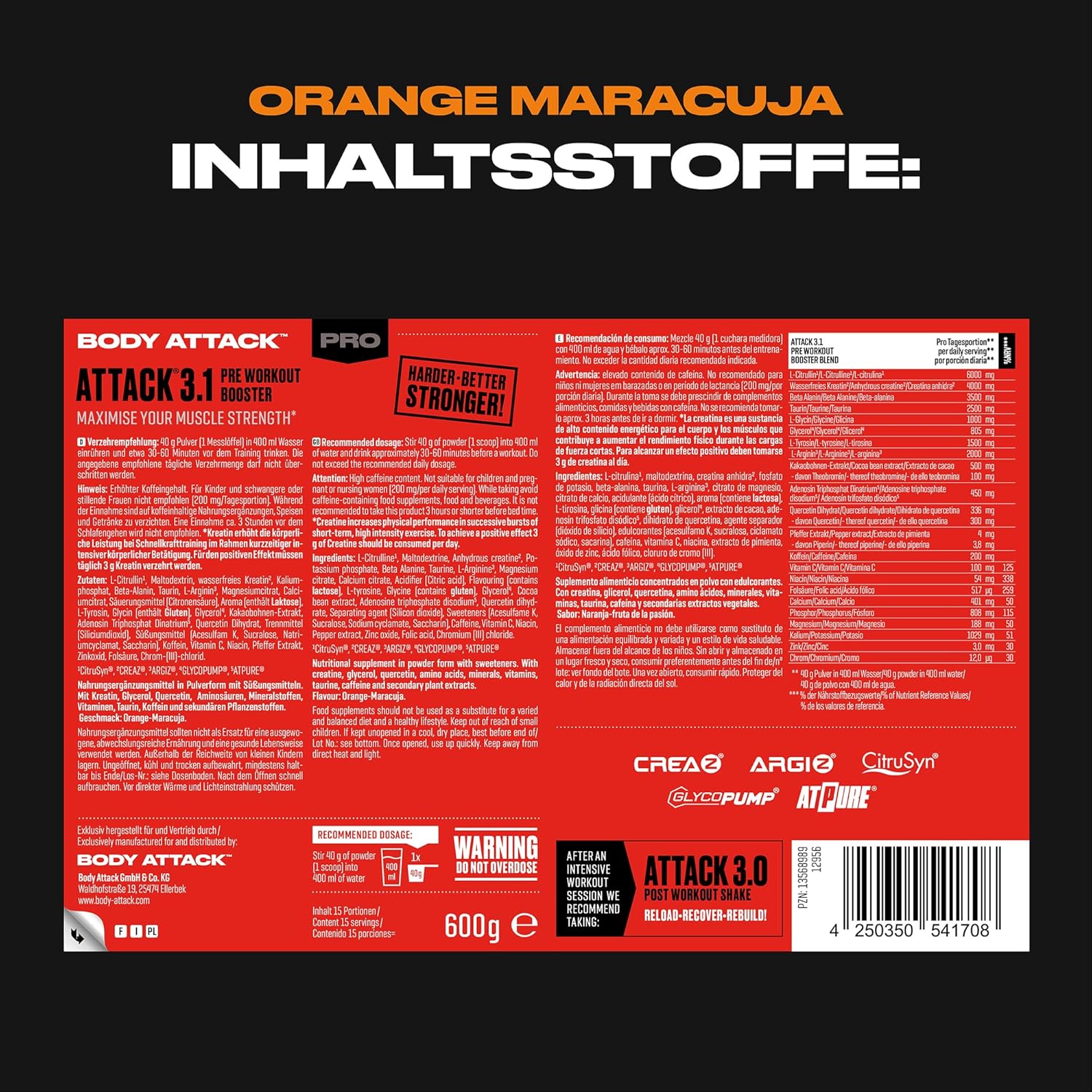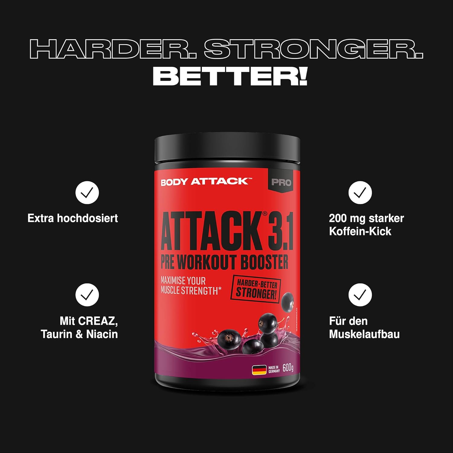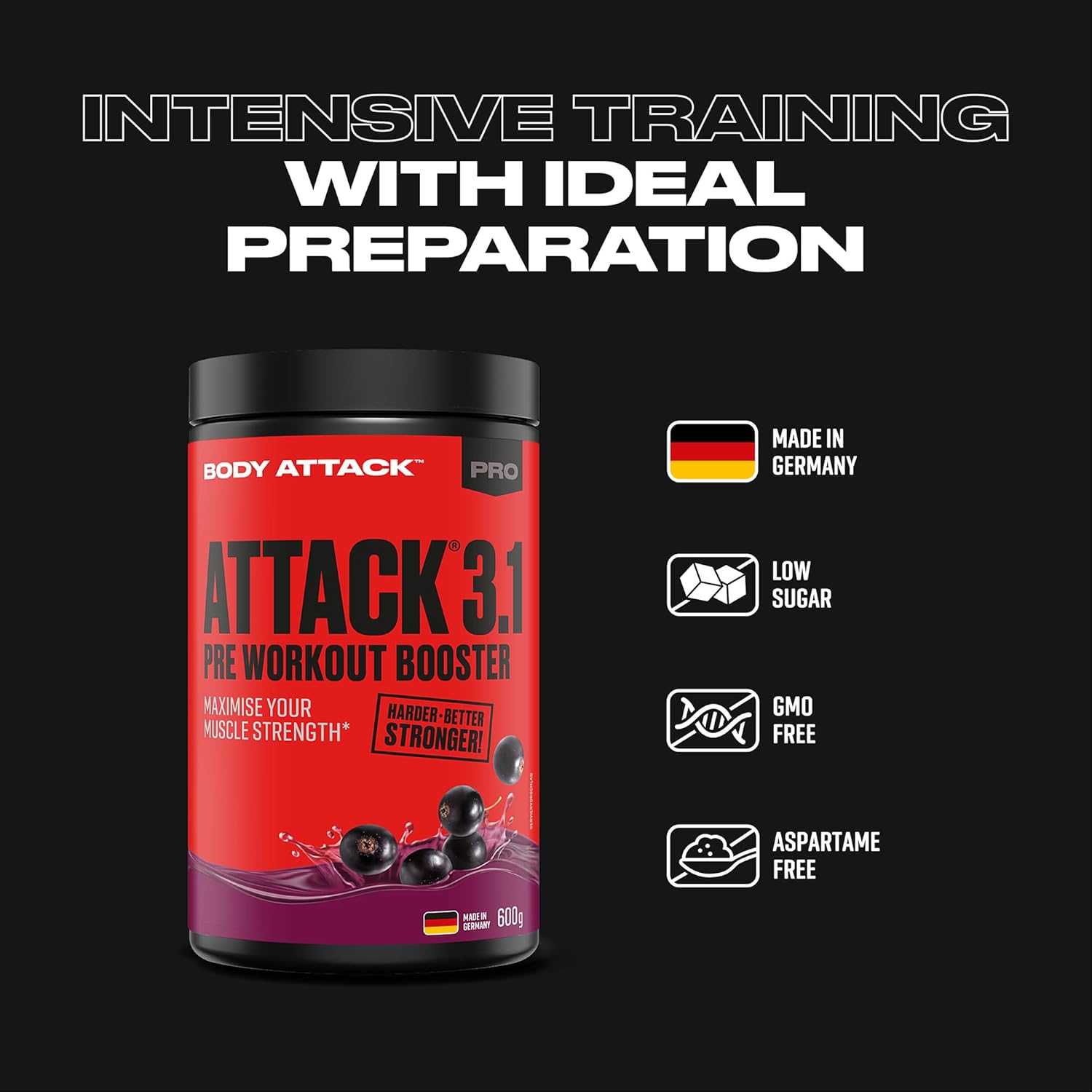 - Made in Germany: Short supply chain, high-quality raw materials and effective formulas: Body Attack is synonymous with certified “Made in Germany” quality. These values are also extended to PRE ATTACK 3.1
