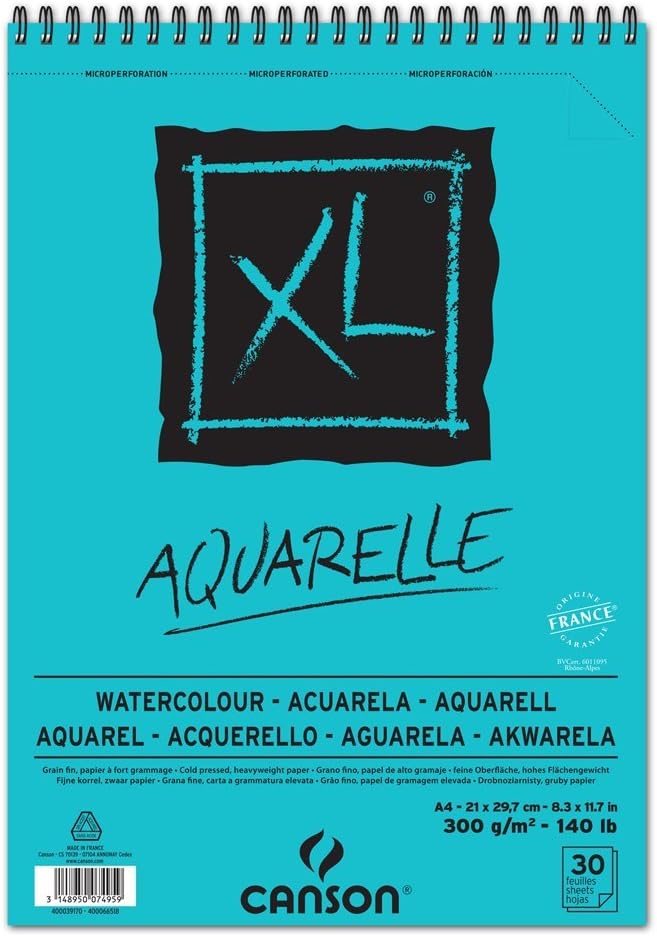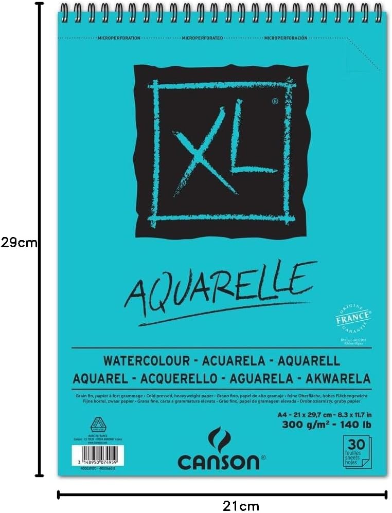 ست کاغذ آبرنگ Canson XL Aquarelle 2 تایی – مارپیچ در سمت کوتاه – 30 برگ – دانه ریز – 300 گرم – A4