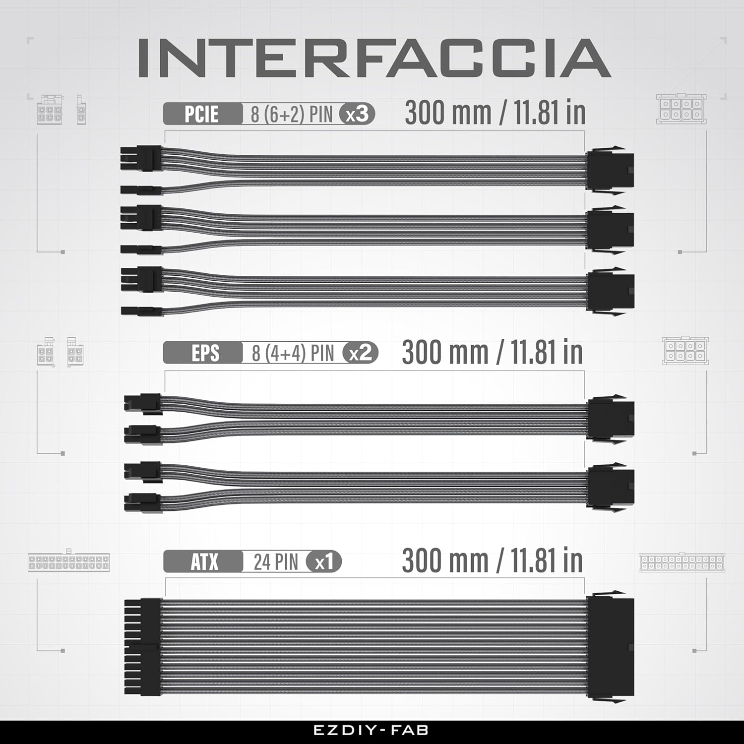 کابل پسوند EZDIY-FAB PSU با آستین معقول GPU PC POWN FOWN NYLON WHEELED با PETINE 24PIN/3X 8PIN KIT 6+2PIN/2X 8PIN A 4+4PIN-300MM/11.8IN-CARBON