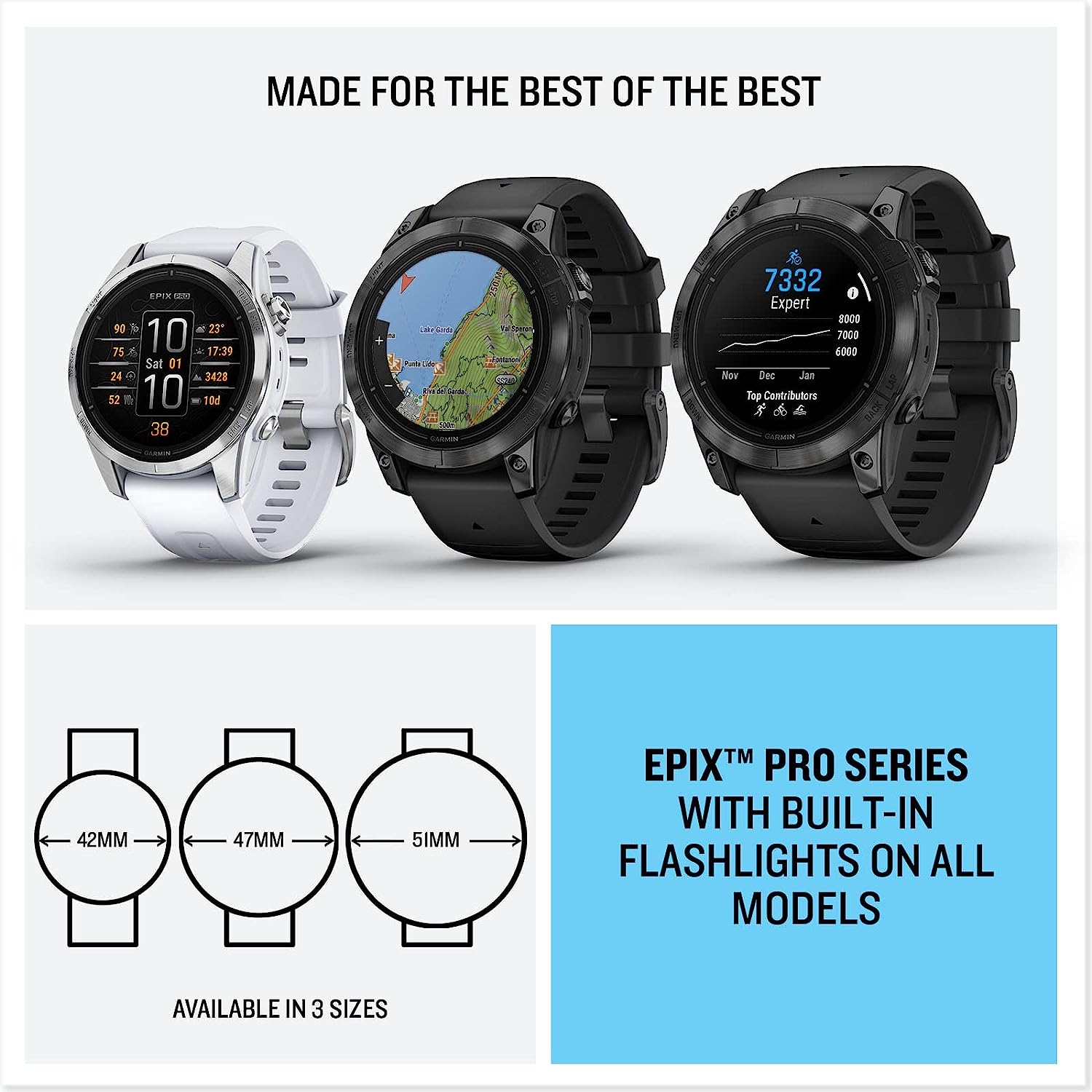 شرح محصول در تمام روز، هر روز – epix Pro ساعت هوشمند با کارایی بالا است که به شما کمک میکند در هر ساعت از روز یا شب بیشترین بهره را از آن ببرید. دارای بالاترین فناوری گارمین برای ورزش، تمرین و فعالیت در فضای باز است. همه با صفحه نمایش AMOLED بسیار روشن خیره کننده و تا 31 روز عمر باتری در حالت ساعت هوشمند.