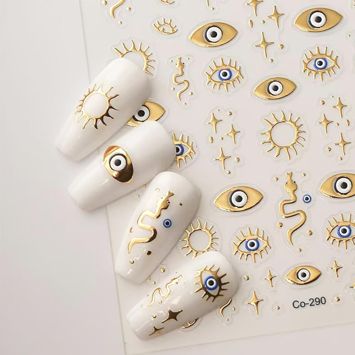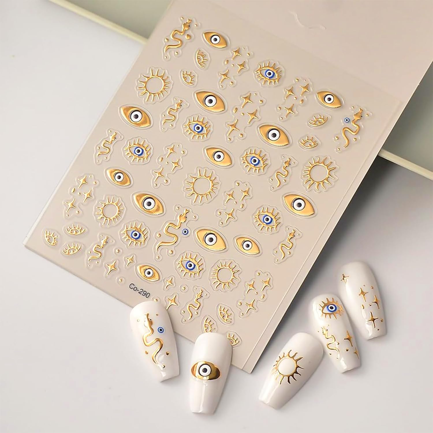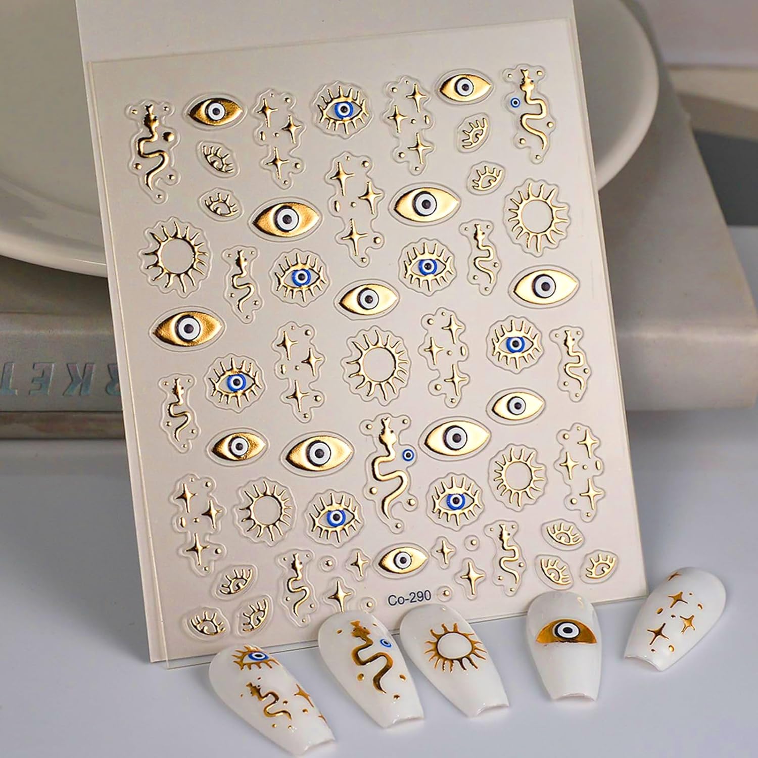 - 3D Golden Design: TELAIN 3D golden nail stickers with Evil Eye and Star-Snake patterns offer unique embossed effects that make your nails more realistic and eye-catching. Perfect for individual and exclusive nail designs