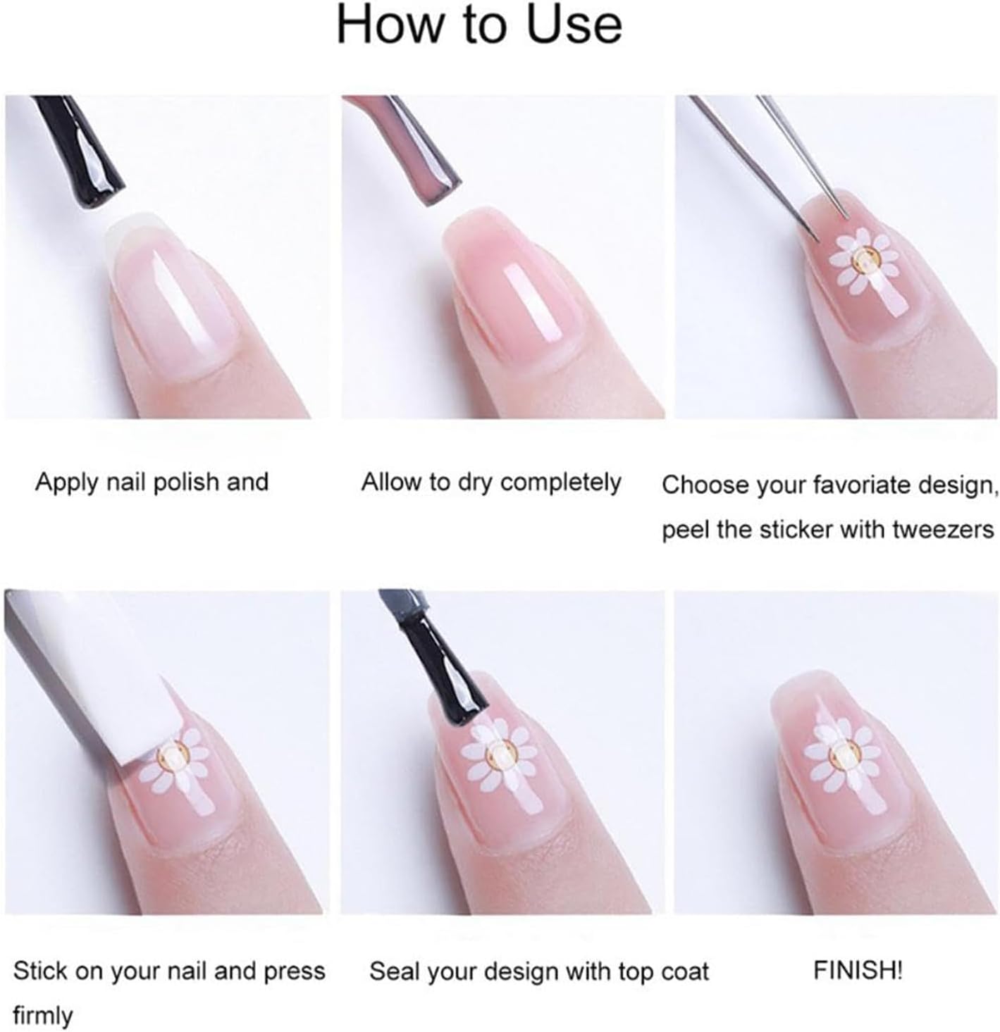 - Simple application: Apply nail polish first, paste the sticker and seal it with clear nail polish. Note: Nail polish is not included in the package