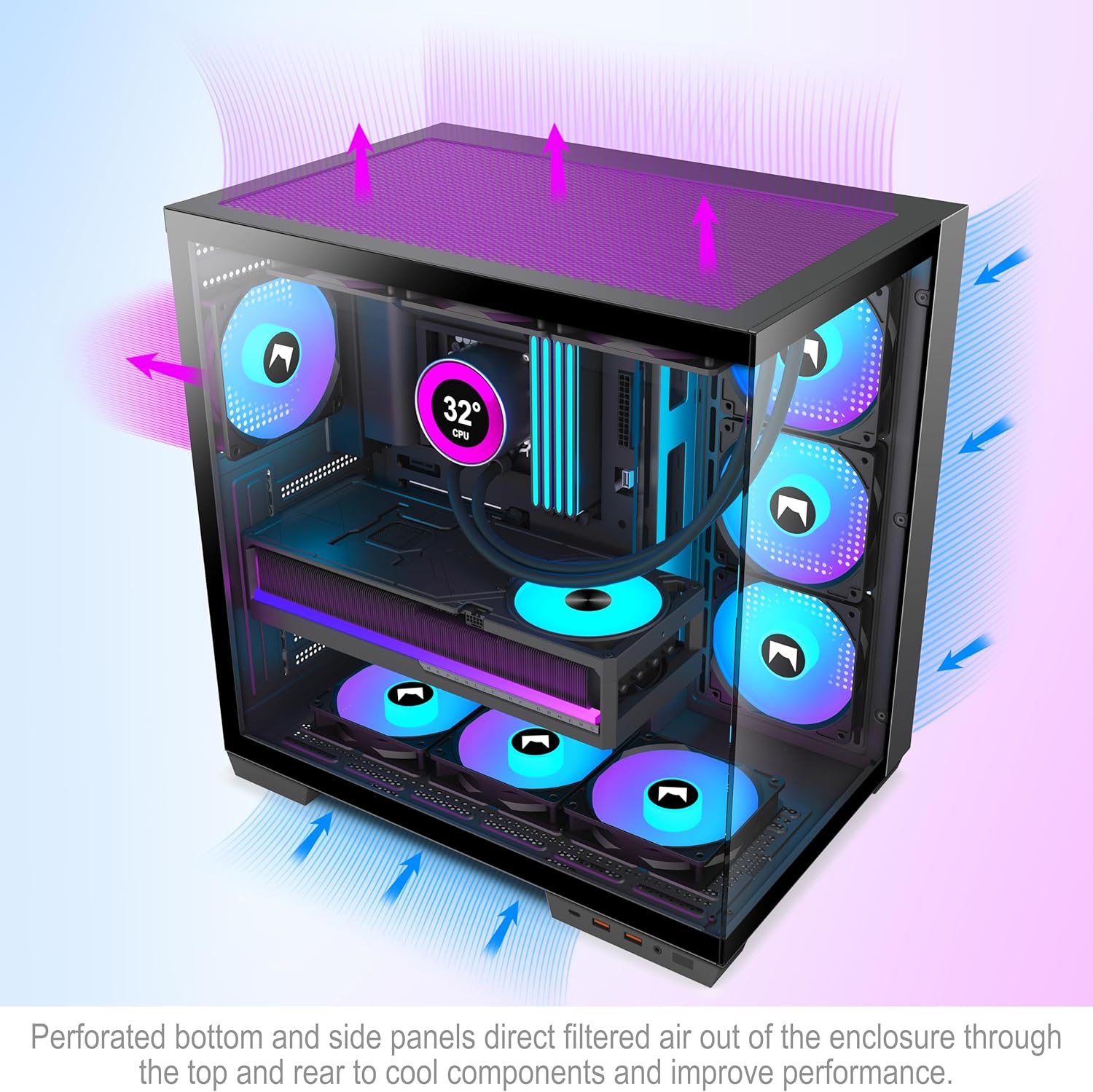 - 【Pre-installed 7 ARGB PWM fans】3×120mm reverse blade fans (ARGB PWM) at the bottom, 3×120mm reverse blade fans (ARGB PWM) on the side, and 1×120mm forward blade fans (ARGB PWM) on the rear. Using the daisy connection method, the cable management is more concise, no need for a controller to connect to the motherboard software to control it, customize a variety of lighting modes, and create cool and colorful lights! The fan speed can be controlled using software.