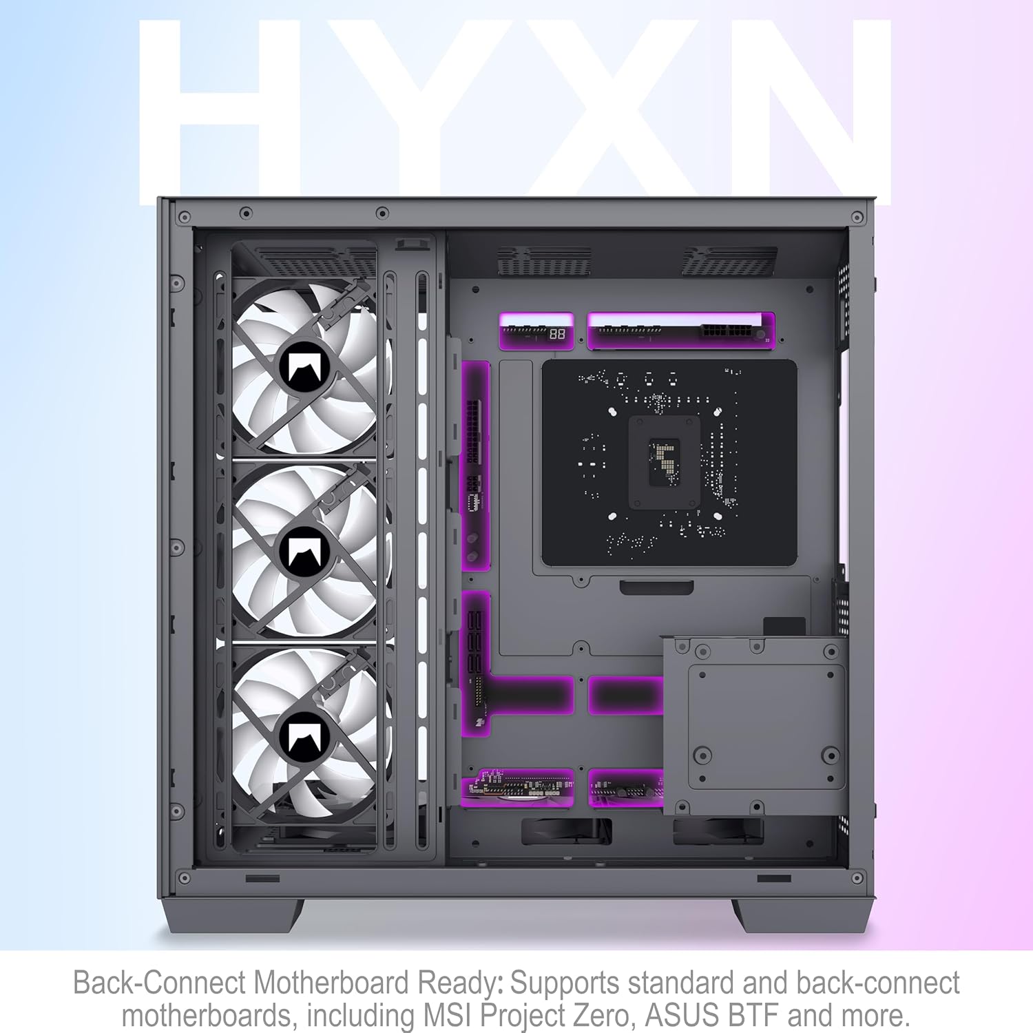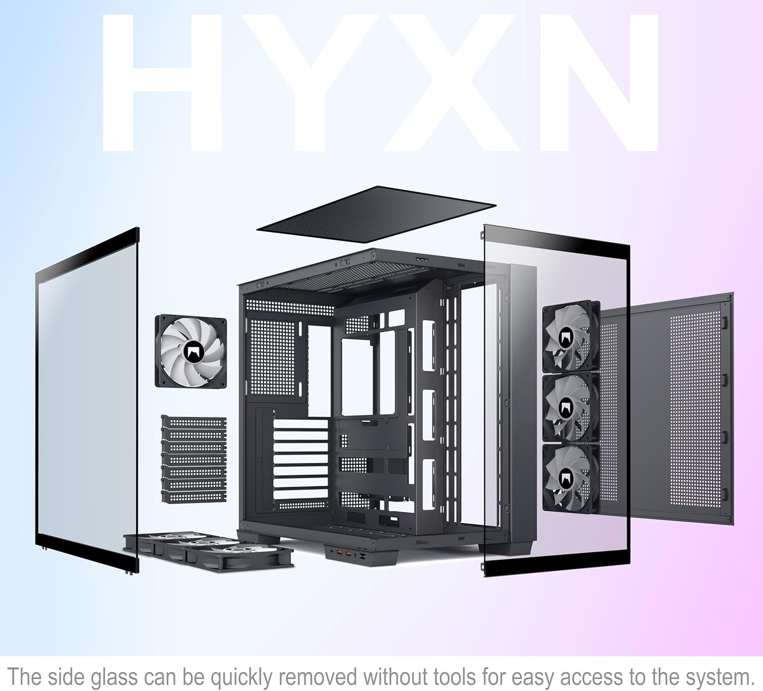 - 【Dual-chamber aesthetic design】HYXN H1 is a panoramic 270° wide-angle field of view ATX mid-tower rectangular structure chassis developed for aesthetics. The H1 is more spacious than most similar ATX cases on the market, providing users with a powerful and high-end configuration and a cool visual experience. The PC tower case is composed of two transparent tempered glass panels, which transmit light naturally, and the tempered glass has high hardness, not easy to be damaged, and has good sound insulation effect, providing great comfort for the office/gaming environment! (Length, width and height: 420*285*430mm/16.5"*11.2"*17.3)