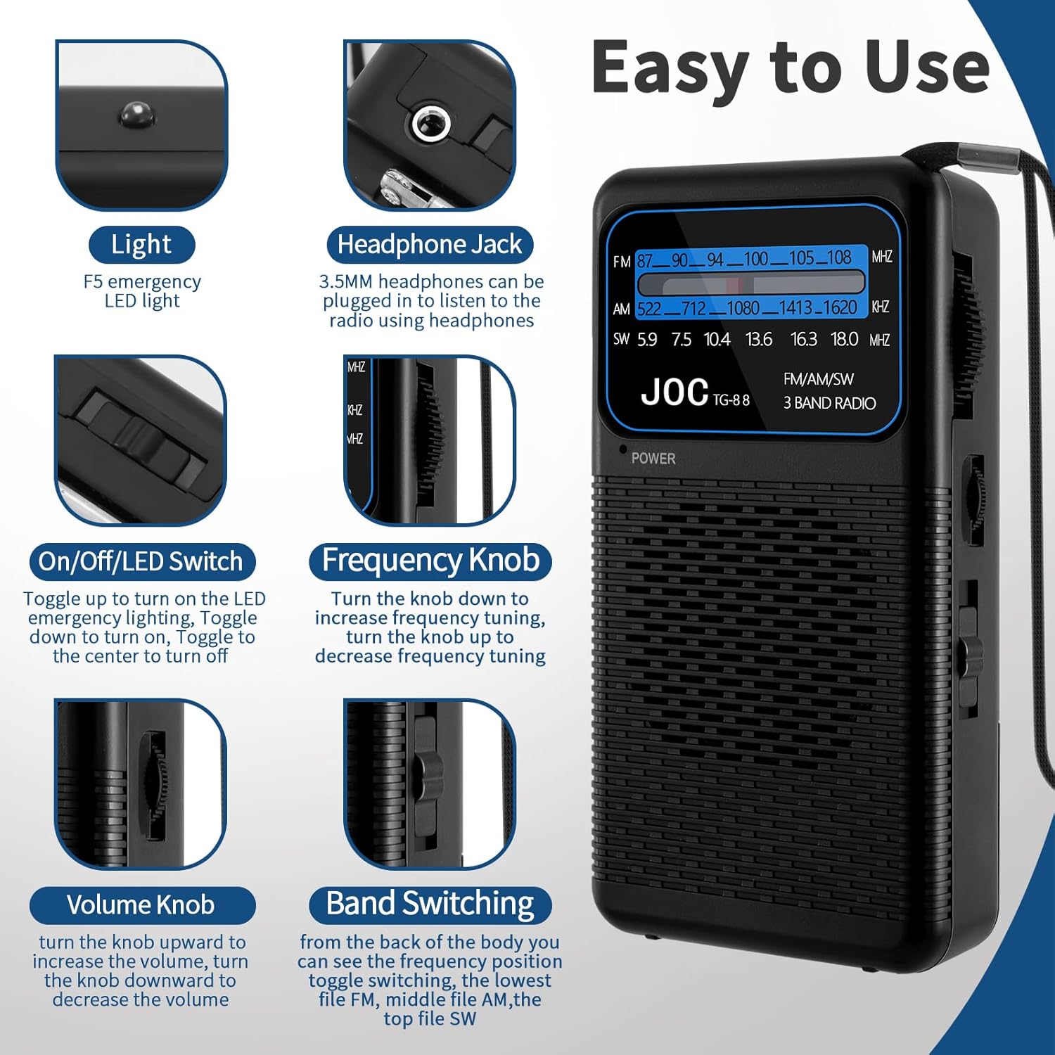 - [PRACTICAL ADDITIONAL FEATURES] The radio includes an emergency light and a retractable antenna for better signal reception. Designed to meet your everyday needs, this small portable radio is ideal for use anytime, anywhere.