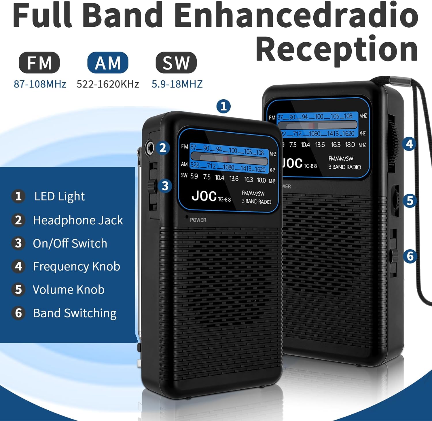 - Supported radio bands: AM, FM, shortwave