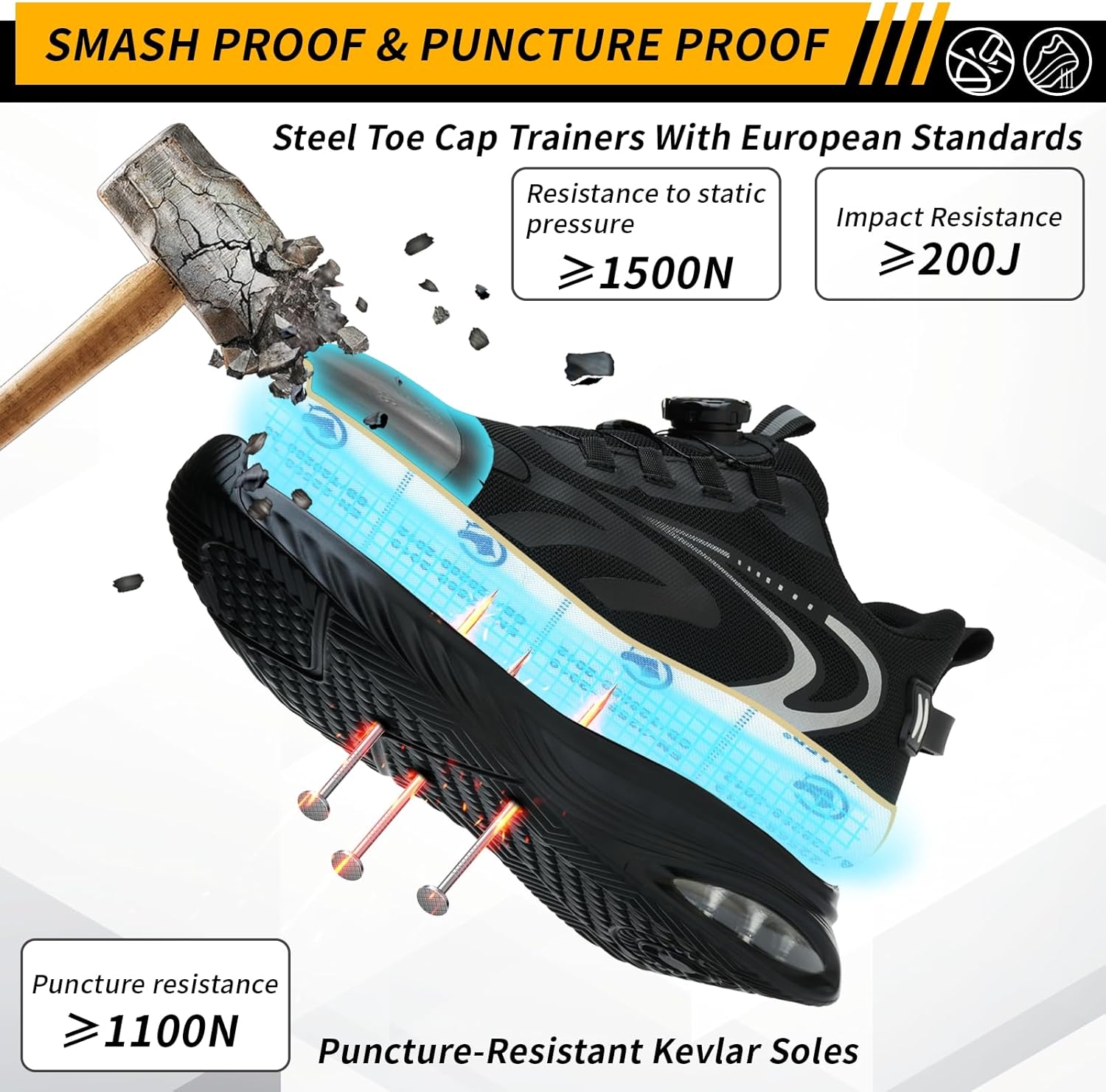 - Internal material: Breathable Inner Material: Comfortable and breathable knitted lining allows your feet to breathe freely. The European-standard steel toe cap can withstand an impact force of more than 200J, protecting your feet from falls and objects rolling while you work.