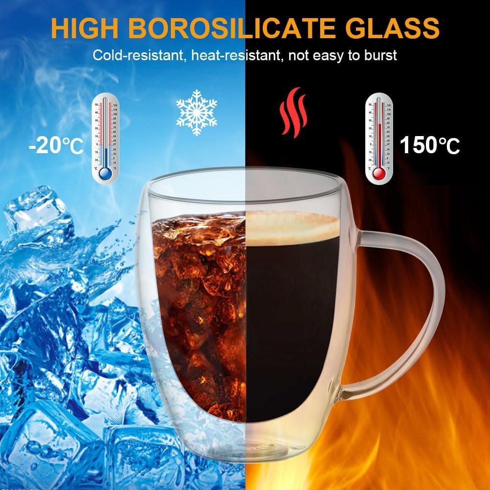 - ☕【Double Wall Insulation Design】Double wall insulating glass design allows the mug to be safe in contact with hot drinks and will not condense with cold drinks. Plus, your drink will stay hot or cold longer than a layer of glass under the same conditions, keeping your favorite coffee at the ideal temperature for longer.