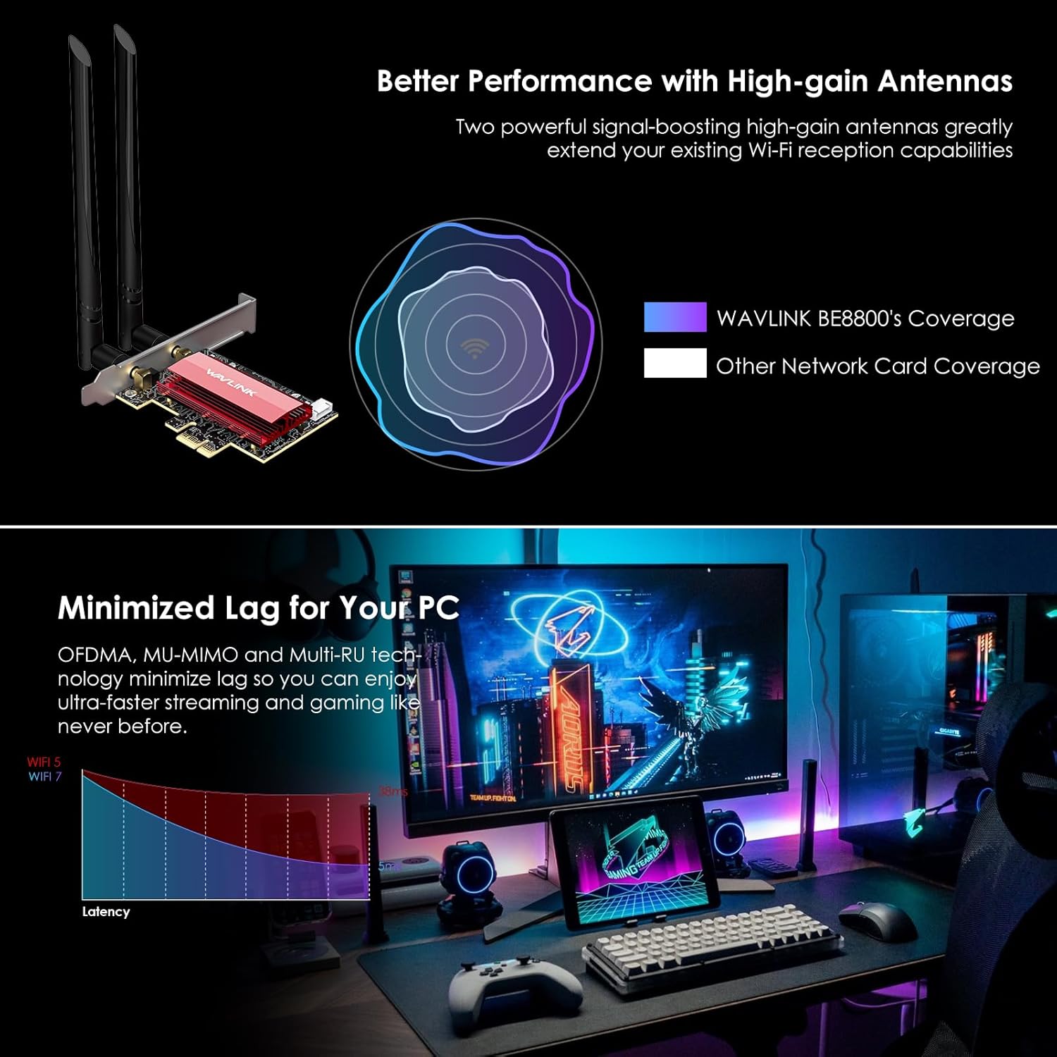 - 【Wi-Fi 7】 Pioneering technology】 Thanks to Wi-Fi 7 technology, this tab offers all the functionality of the 6 Ghz band, offering an exceptional bandwidth and dedicated channels and without congestions, designed to measure for your desktop. Thanks to improvements such as 4096-Qam and 320mHz, this adapter reaches stunning wireless speeds, allowing the uninterrupted reproduction of multimedia flows at the same time.