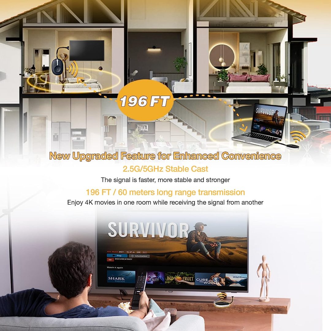 فرستنده و گیرنده بی سیم HDMI 4K، رسانه پخش ویدئو/صوت/فایل HDMI بی سیم، برای لپ تاپ، دوربین، جعبه کابل، نتفلیکس، PS5، تلفن به مانیتور، پروژکتور، HDTV 165FT