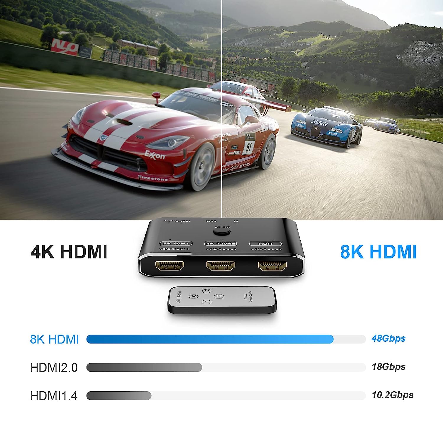 توضیحات محصول سوئیچ HDMI 2.1 8K 2.1 با کنترل از راه دور، پورت 3*HDMI 2.1 برای دستگاه منبع، 1: پورت HDMI 2.1 برای مانیتور یا تلویزیون HDMI 2.1، به طور موثر مشکل رابط HDMI2.1 کافی را حل کرد راهنمای اتصال: 1: خارج شوید سوئیچ از بسته خود 2: منبع 1، منبع 2، منبع 3 را از سوئیچ ما با سه کابل HDMI جداگانه به دستگاه های منبع HDMI خود وصل کنید (اگر 3 دستگاه دارید باید متصل شوند) 3: "نمایشگر" را به مانیتور HDMI خود وصل کنید . 4: اتصال بین دستگاه منبع سیگنال و مانیتور سوئیچر ما باید کاملاً مطابق با علامت گذاری روی محصول باشد و اتصالات مختلط اکیداً ممنوع است. 5: کابل USB را برای منبع تغذیه به دستگاه USB خود وصل کنید. این سوئیچر HDMI 8K از وضوح تصویر تا 8K@60Hz،4K@120Hz پشتیبانی می کند. این برای خروجی 4K@120Hz HDR در تلویزیونهای HDMI 8K شما از طریق PS5 و X Box x، یا دیگر آخرین دستگاههای منبع HDMI 2.1 8K کاملاً کار میکند. برای دوستداران بازی، PS5 یا Xbox x را از طریق سوئیچ HDMI ما به تلویزیون 8K خود وصل کنید، و سپس خروجی 4K@120Hz داشته باشید، که تجربه بازی روانی را برای گیمرها به ارمغان می آورد. 1x ریموت کنترل