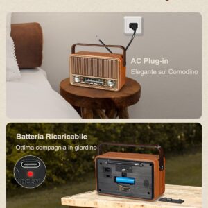 رادیو قابل حمل FM/AM/SW چوبی قدیمی PRUNUS J-120، بلندگوی بلوتوث یکپارچهسازی با سیستمعامل، رادیو قابل حمل با باتری قابل شارژ 1800 میلی آمپر ساعتی پیشرفته، برق AC موجود، پشتیبانی از TF/USB/AUX. طلا